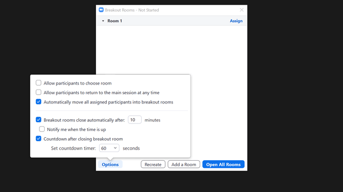 In theory, you, as host, always determine the length of the breakout rooms. You can leave the length open and manually choose to close the rooms, with a ‘broadcast message to all’ warning further in advance than the set 60 seconds if you wish. But it is worth checking the ‘Options’ in thebottom left of the window which appears only after your create your rooms – as this can be set at 10 minutes, I discovered!