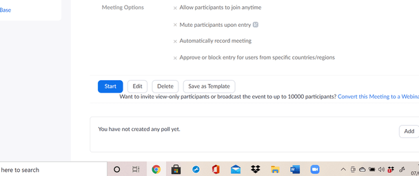 Next, to add your Poll, you need to schedule your meeting. Once you have done this, you need to save your meeting details – using the big blue button at the bottom of the meeting page. This may involve a quick scroll, based on the principle that anything you need will never be at the top of a page. Don’t ask me why, but then, and only then, will you be offered the opportunity to add a poll. Right at the bottom of the page (of course) you will get a mildly bossy message that you ‘Have not added any polls yet’ with an option to create one.