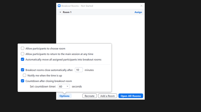 In theory, you, as host, always determine the length of the breakout rooms. You can leave the length open and manually choose to close the rooms, with a ‘broadcast message to all’ warning further in advance than the set 60 seconds if you wish. But it is worth checking the ‘Options’ in thebottom left of the window which appears only after your create your rooms – as this can be set at 10 minutes, I discovered!