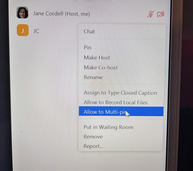 If you need to follow more than 1 speaker in a larger video format, ask the host to ‘allow to Multi-pin’. They do this by clicking on Participants, your video (top right) then selecting this option. You should then see that you have an option to ‘Add pin’ on other videos. If Multi-pinning is not enabled, you will only be able to pin one video at a time. So when you request another, it will offer to only ‘Replace pin’). If you are the host, you have Multi-pinning as an automatic option.