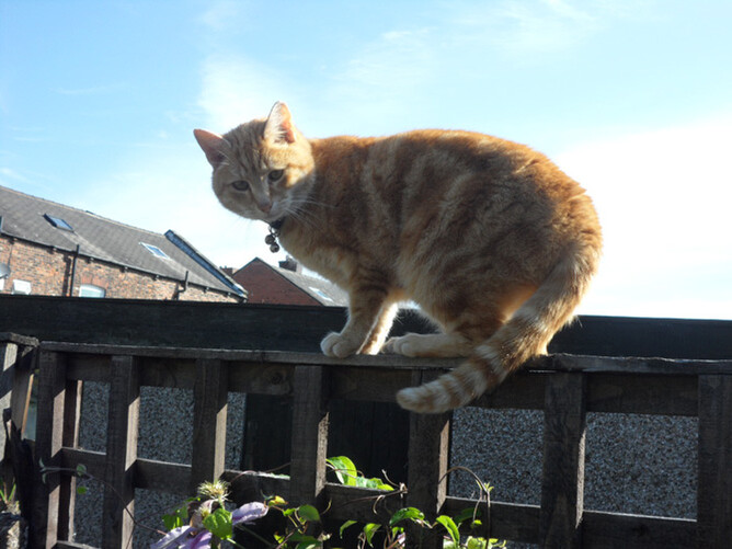Mystery of the month: Why does Hamlet (next door’s semi-adopted cat, pictured) choose to spend so much time sitting on the fence between our houses? Is he an undecided voter as regards the quality of feline catering in each household? Or is he practising some mystical meditation which enables a medium-sized cat to actually be oblivious to the discomfort of the narrow fence on which he is seated? (NB: Naturally when I arranged a photo session to illustrate this, Hamlet, like all celebrities, declined to be pictured in the requested position, as it clearly did not show his best side).
